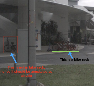 - 도로 위나 인도나 자전거 전용도로에 있는 자전거를 의미합니다. 단, 오토바이처럼 옆에 서 있는 사람은 포함하지 않습니다.