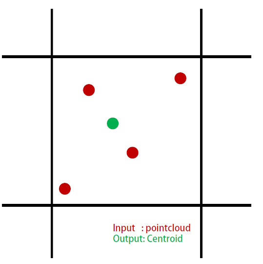 Voxelization은 Point Cloud를 말 그대로 voxel화 해주는 기능입니다. 위의 그림처럼 여러 개의 Point들이 있을 때 공간을 일정한 크기로 나누어 그 크기 내의 Point들의 평균을 냅니다. 따라서 한 공간에 4개의 Point가 있다면 1개의 Point로 나타내주기 때문에 효율적으로 Point Cloud를 관리할 수 있습니다. Point의 수가 적어지기 때문에 memory를 적게 잡고 다른 후처리를 할 때도 연산 대상이 줄었기 때문에 연산 속도가 상당히 올라갑니다.